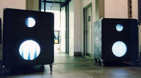 Inside each speaker there were two VHS-players and one 14 '' tv